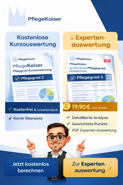 Neben der kostenlosen Kurzauswertung können Sie eine ausführliche Expertenauswertung mit detaillierter Analyse aller Module und gewichteten Punkte erhalten – ideal zur Vorbereitung auf die MD-Begutachtung oder zur Überprüfung eines bestehenden Pflegegrades.