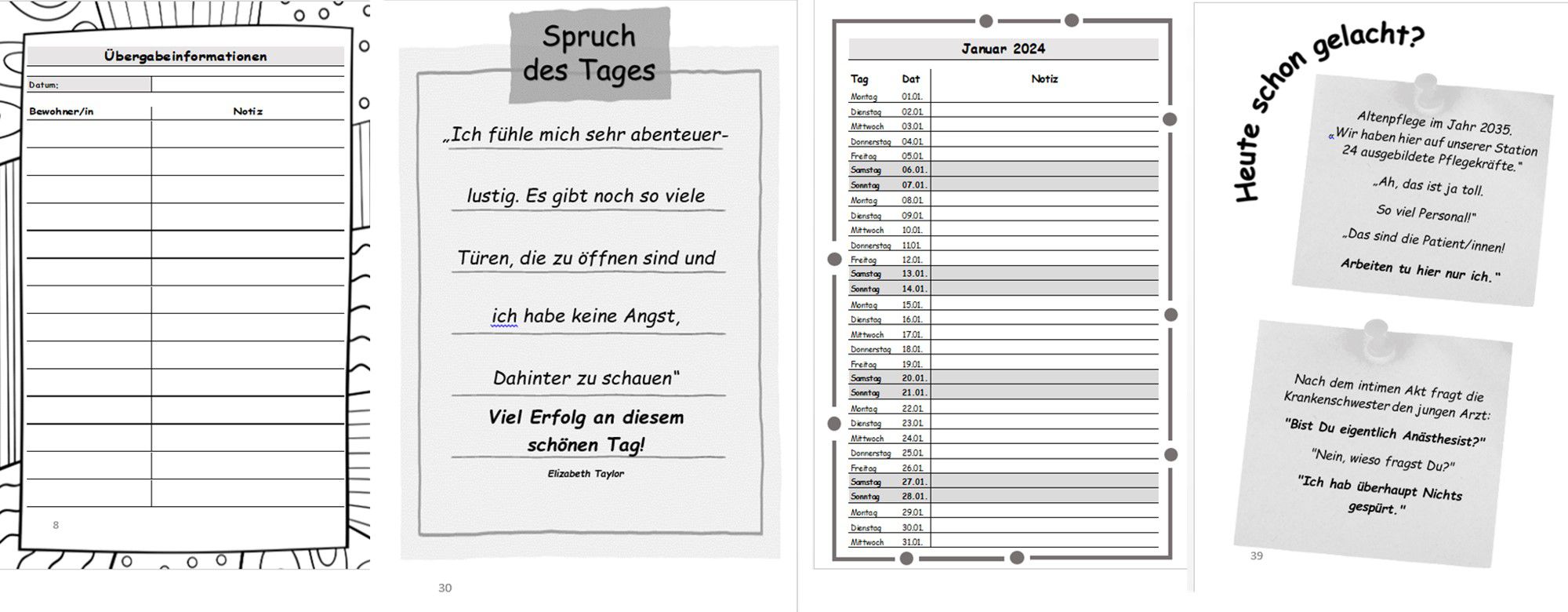 Am 13. Januar 2023 war es dann endlich soweit, dass ich das Buch bei Amazon veröffentlichen konnte. Am Ende ist es eine Kombination zwischen Geschichtensammlung, Kalender und Tage- und Poesiebuch geworden, so dass das Buch neben den lustigen Geschichten auch einen praktischen Nutzen im Pflegealltag bietet.