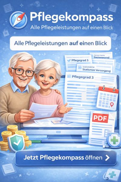 Der Pflegekompass zeigt Ihnen übersichtlich, welche finanziellen und unterstützenden Leistungen Ihnen je Pflegegrad zur Verfügung stehen – verständlich, aktuell und unabhängig erklärt.
