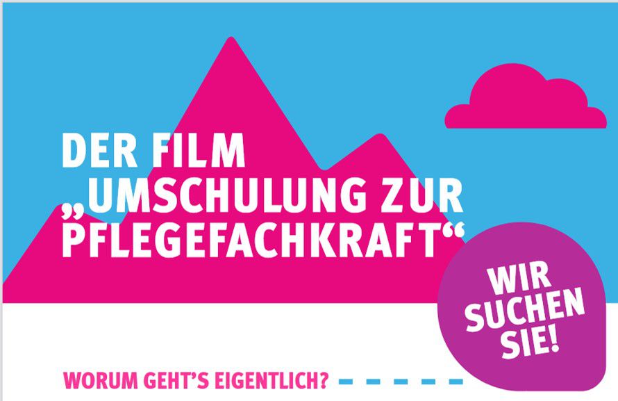 Im Rahmen der bundesweiten Informations- und Öffentlichkeitskampagne zu den neuen Pflegeausbildungen „Mach Karriere als Mensch!“ soll ein 30-sekündiger Film zum Thema „Umschulung zur Pflegefachkraft“ entstehen. Dieser soll unterschiedliche Facetten aus dem Arbeitsalltag dreier Umschülerinnen und Umschüler zeigen. Der Film soll potentiellen Auszubildenden einen Eindruck in das verantwortungsvolle Tätigkeitsfeld von Pflegefachkräften geben und Lust auf eine Umschulung zur Pflegefachkraft machen.