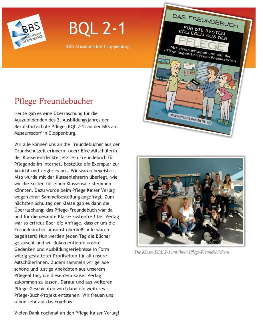 Vor einiger Zeit erreichte mich die Anfrage einer Schülerin der Klasse BQL 2-1 von der der Altenpflegeschule "BBS am Museumsdorf Cloppenburg", die nach einem persönlichen Angebot für 16 Freundebücher suchte.