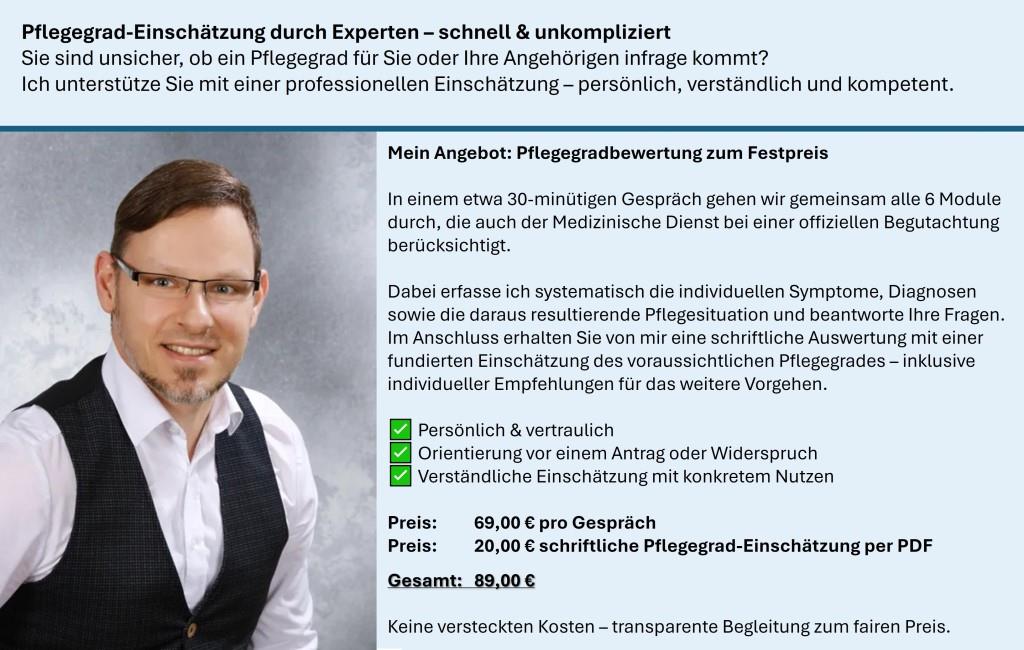 Die Pflegegrad-Einschätzung biete ich zum Festpreis von 69,00 € + 20,00 € für die schriftliche Pflegegradeinschätzung an.